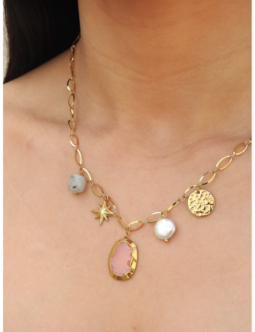 Colar em Aço Inoxidável. O quartzo branco é um cristal de energia suave, profundamente protetora e que traz harmonia e purificação. A ametista, de cor violeta, tem propriedades calmantes, que ajudam a diminuir a sensação de ansiedade e stress.